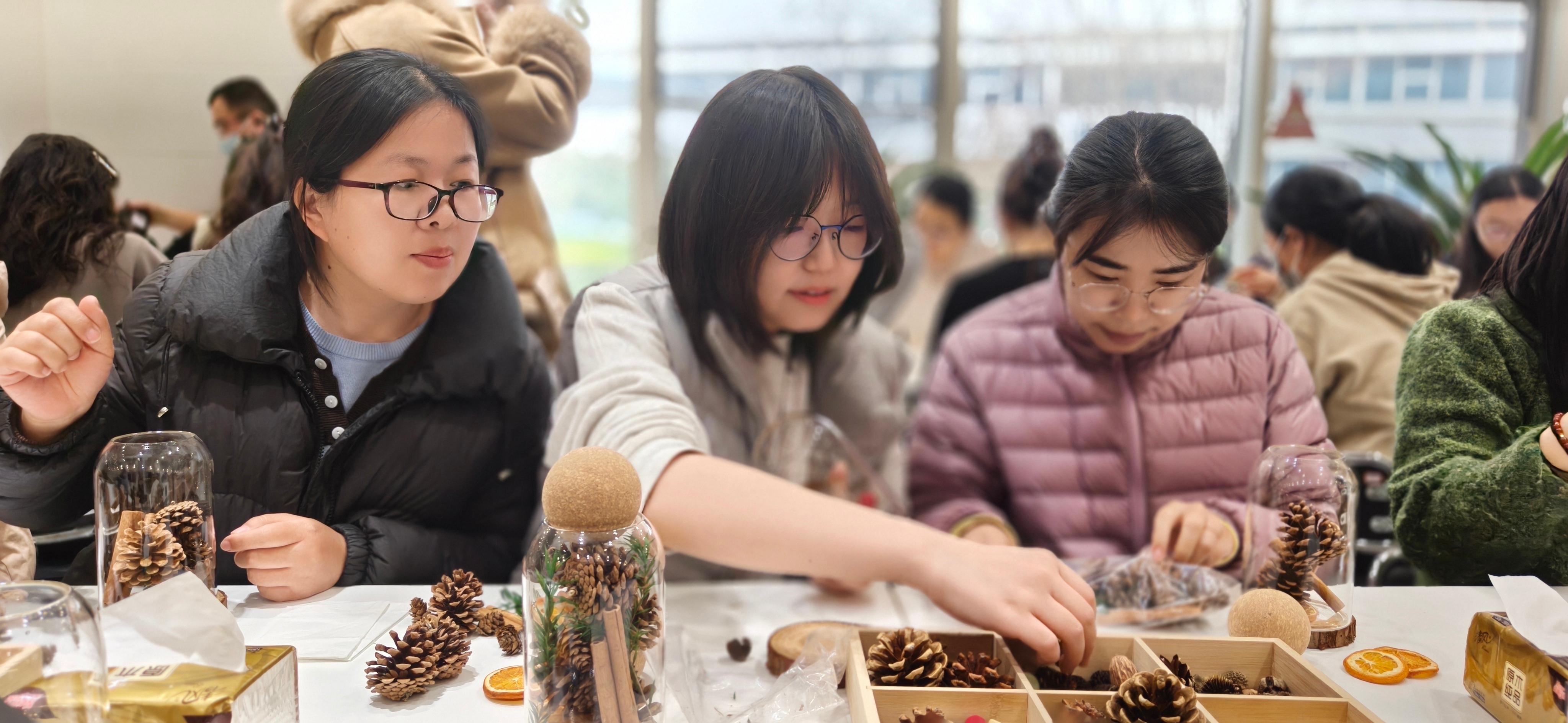 活动现场温馨雅致,工作人员提前准备了松果、干花、精油等制作物料。大家认真学习制作步骤,自主挑选香调、搭配色彩。在轻松愉悦的氛围中,大家相互交流、彼此协助,尽情发挥创意,将松果、干花与香氛巧妙融合,制作成一盏盏造型别致的手工香薰蜡烛。
